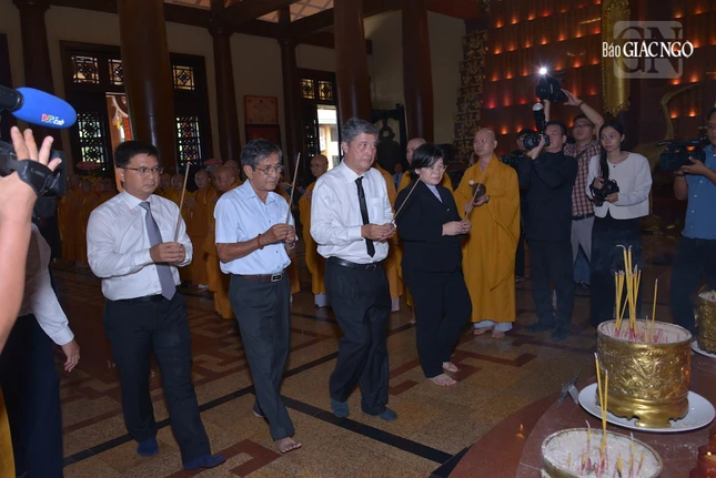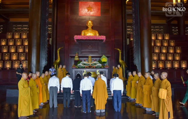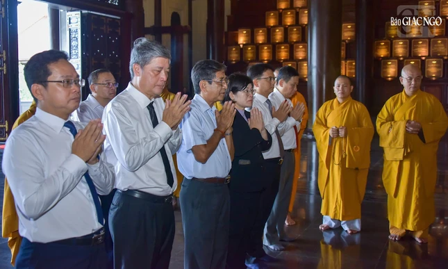 Tiếp đó, Đức Pháp chủ, chư tôn đức Tăng Ni cùng lãnh đạo Thành phố đã dâng hương tưởng niệm anh linh các anh hùng, liệt sĩ tại chính điện Đền Bến Dược.