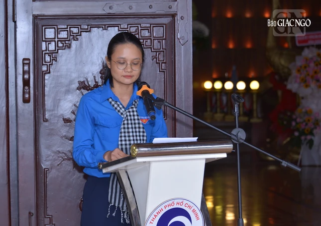 Tiếp đó, chị Trần Thu Hà, Chủ tịch Hội sinh viên Việt Nam TP.HCM, đại diện cho thế hệ trẻ của Thành phố bày tỏ lòng tri ân đối với sự hy sinh lớn lao của các anh hùng, liệt sĩ đã hy sinh tuổi thanh xuân cho nền độc lập, tự do của Tổ quốc. Sự hy sinh đó là tấm gương sáng nhắc nhở thế hệ trẻ của đất nước phải luôn phấn đấu trong học tập, lao động, xây dựng Tổ quốc Việt Nam ngày càng phát triển, sánh vai với các cường quốc năm châu.