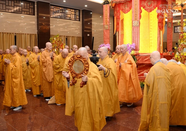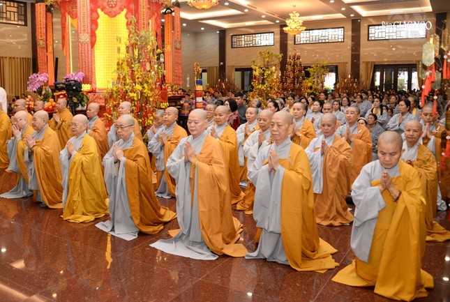 Đối trước Đức Pháp chủ GHPGVN, đại diện toàn thể Tăng Ni thuộc Ban Trị sự GHPGVN TP.HCM, các ban chuyên môn, Ban Trị sự TP.Thủ Đức, 21 quận huyện, Hòa thượng Thích Lệ Trang, Phó Chủ tịch Hội đồng Trị sự, Trưởng ban Nghi lễ T.Ư, Trưởng ban Trị sự Phật giáo TP.HCM đại diện dâng lời khánh tuế Đức Pháp chủ GHPGVN, Chứng minh Đạo sư Phật giáo TP.HCM.