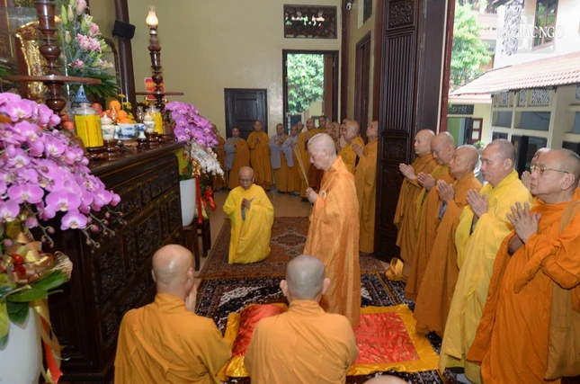 Sau khi Đức Pháp chủ GHPGVN đảnh lễ Tam bảo tại chánh điện và dâng hương tưởng niệm Đại lão Hòa thượng Thích Tịnh Khiết tại Tổ đường của thiền viện Vạn Hạnh, chư tôn đức môn hạ Đức Tăng thống, Tăng chúng và Phật tử thiền viện Vạn Hạnh đảnh lễ khánh tuế.