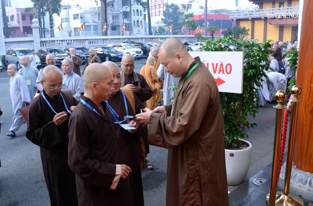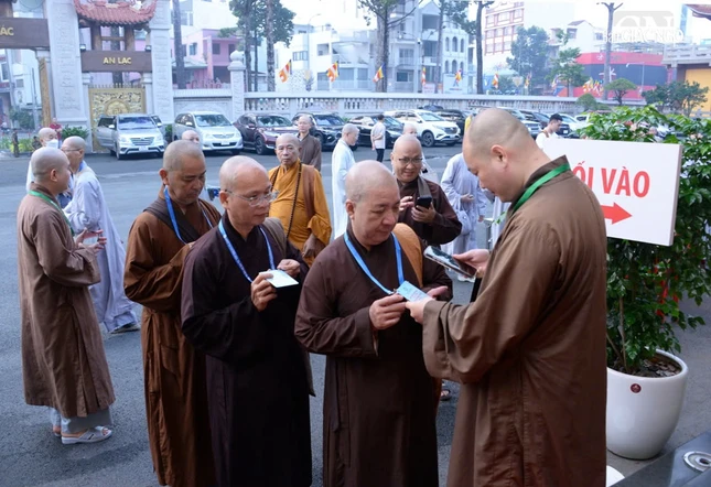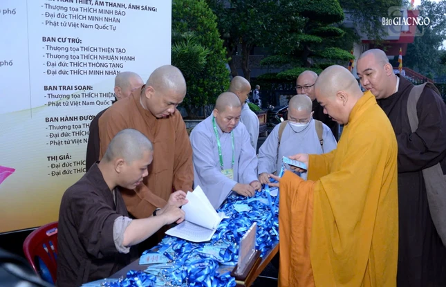 Chư tôn đức Tăng Ni chuẩn bị làm thủ tục tham gia Tuần huân tu và Khóa bồi dưỡng trụ trì năm 2025 tại Việt Nam Quốc Tự