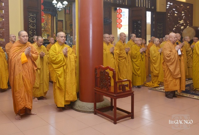 Chư vị giáo phẩm Trưởng lão, Tăng Ni vân tập trước Tổ đường Ấn Quang, dâng hương cúng dường, đảnh lễ lịch đại Tổ sư và Giác linh Đại lão Hòa thượng Thích Thiện Hòa. Đại chúng đồng thanh trì tụng Tâm kinh Bát-nhã, Đại lão Hòa thượng Thích Trí Quảng thành kính dâng trà cúng dường, tri ân công đức của Đại lão Hòa thượng Thích Thiện Hòa, bậc long tượng dốc lòng vì Phật giáo Việt Nam, đặc biệt là trong việc đào tạo Tăng tài.