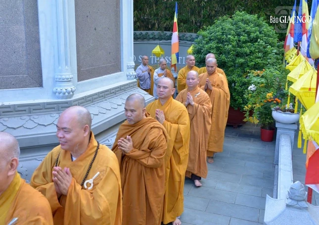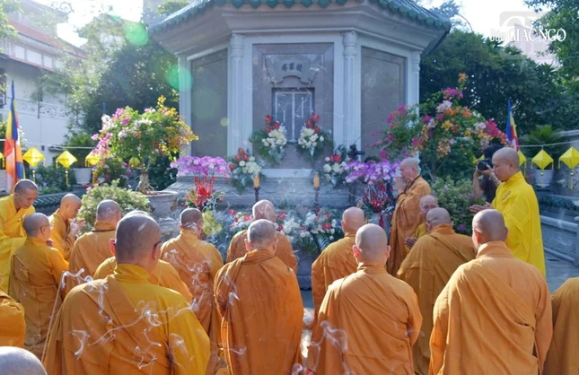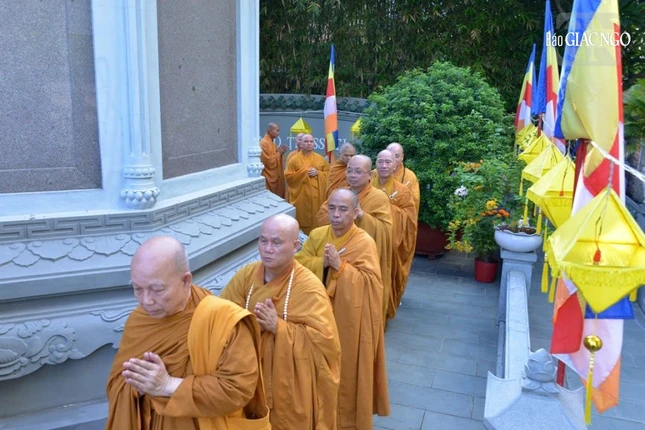 Tiếp đó, chư tôn đức đã dâng hương nhiễu bảo tháp Pháp Lạc - nơi lưu giữ nhục thân Trưởng lão Hòa thượng Thích Minh Châu trong khuôn viên thiền viện Vạn Hạnh.