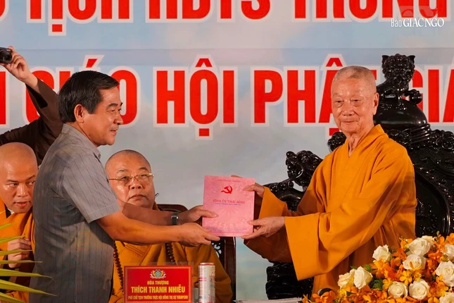 Đại diện Ban Thường trực Ban Trị sự GHPGVN tỉnh Thái Bình, Thượng tọa Thích Thanh Hòa đã dâng lời khánh tuế nhị vị Trưởng lão Pháp chủ và Phó Pháp chủ; đồng thời báo trình về tình hình của Phật giáo tỉnh nhà.