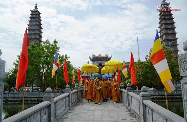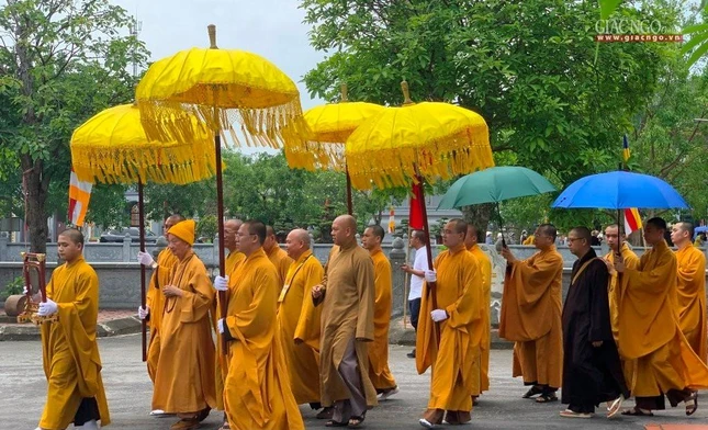 Cung nghinh Đức Quyền Pháp chủ có Hòa thượng Thích Quảng Hà, Phó Chủ tịch Hội đồng Trị sự, Trưởng ban Trị sự GHPGVN tỉnh Nam Định và chư Tăng Ni, cùng đông đảo Phật tử.
