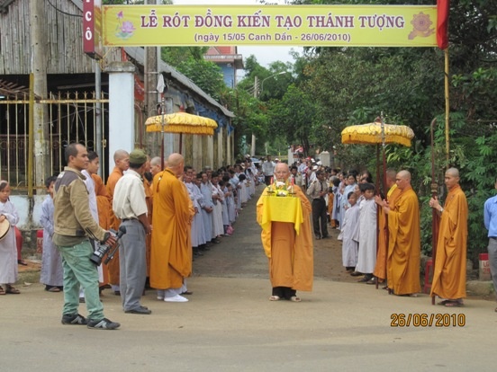 Nghi lễ diễn ra thật long trọng và trang nghiêm. Tiếng niệm Phật trầm hùng của toàn thể đại chúng đã làm cho không khí buổi lễ vô cùng thiêng liêng. Mặc dù không khí của lò đúc không mấy dễ chịu, nhưng Hòa thượng chứng minh cũng như Chư tôn dức Tăng Ni và Phật tử đều đã thành tâm cầu nguyện trong suốt thời gian nung đồng cho đến lúc rót đồng vào khuôn. Người điều khiên lò đúc là Phật tử Nguyễn Văn Đệ, một nghệ nhân chuyên về đúc tượng, và pháp khí bằng đồng đến từ làng nghề đúc đồng truyền thống Phường Đúc, TP.Huế. Khi trò chuyện với chúng tôi, nghệ nhân tâm sự: “Chúng tôi đã đúc nhiều tượng Phật, nhiều Đại hồng chung cho các cơ sở Phật giáo ở nhiều nơi trong nước. Nhưng hôm nay đúc tượng ở đây, chúng tôi cảm thấy rất xúc động và cảm phục trước sự thành tâm chú nguyện của Chư tôn đức Tăng Ni và đồng bào Phật tử tại tu viện An Lạc này. Và đặc biệt hơn nữa, đây là những bức tượng được đúc từ 1.000 miếng đồng có khắc hình tượng con rồng thời Lý để chào mừng lễ kỷ niệm 1.000 năm Thăng Long-Hà Nội, chúng con cảm thấy hạnh phúc vì mình có thể đóng góp một chút công sức, tài nghệ của mình vào dịp lễ kỷ niệm vô cùng đặc biệt này.”