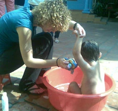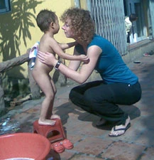 Những tình nguyện viên chúng tôi gặp ở đây đều là những sinh viên Việt Nam và cả nước ngoài. Thật cảm động khi nhìn thấy hình ảnh các cô sinh viên Đức, Ba Lan trẻ trung và xinh xắn đang tắm cho các cháu mồ côi một cách tận tình, kỹ lưỡng và đầy trìu mến. Cô gái Ma Noon, sinh viên khoa tâm lý Trường đại học Maastrichis Hà Lan tâm sự: “Tôi cũng có đứa cháu con ông anh, tôi từng chơi với cháu và chăm sóc cháu nên việc chăm trẻ con không khó lắm với tôi. Tôi thương những đứa trẻ thiệt thòi này nên thấy càng cần phải tận tình với chúng. Ngoài tắm rửa, bế ẵm, dỗ dành và cho ăn, chúng tôi còn dạy các cháu những từ tiếng Anh bằng tranh ảnh và học đếm một cách đơn giản…”