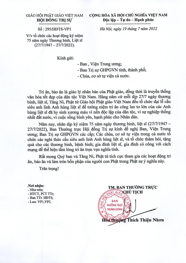 Theo đó, công văn của GHPGVN phổ biến hôm 19-7, khẳng định: "Tình hữu nghị Việt Nam - Lào là tình hữu nghị vĩ đại, là mối quan hệ có một không hai trong lịch sử. Nhân dịp kỷ niệm 60 năm ngày thiết lập quan hệ ngoại giao Việt Nam - Lào (5-9-1962 – 5-9-2022) và 45 năm ngày ký hiệp ước hữu nghị và hợp tác Việt Nam - Lào (18-7-1977 – 18-7-2022), lãnh đạo Đảng, Nhà nước Việt Nam và Lào đã quyết định lấy năm 2022 là năm đoàn kết hữu nghị Việt Nam - Lào, Lào - Việt Nam".