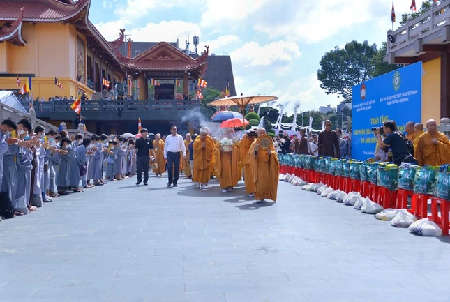 Sáng 18-8, sau lễ rước linh vị các hương linh từ nhiều địa điểm ở TP.Thủ Đức và 21 quận, huyện trên địa bàn TP.HCM về Việt Nam Quốc Tự và lễ khai mạc, chư tôn đức giáo phẩm Tăng Ni và quan khách đã an vị bia đá tưởng niệm đồng bào tử vong vì Covid-19.
