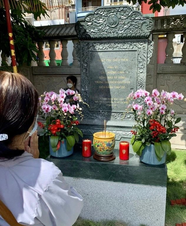 Nội dung văn bia đề chữ: “Phật lực siêu tiến, kính vì các hương linh đồng bào tử vong trong đại dịch Covid-19 siêu sanh Tịnh độ”; lạc khoản ghi: “Phật lịch 2566, Nhâm Dần - 2022, Ban Trị sự GHPGVN TP.Hồ Chí Minh phụng lập”.