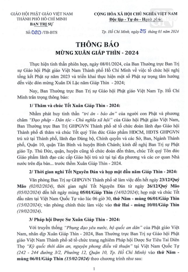 GNO - Hôm nay, 25-1, Hòa thượng Thích Lệ Trang, Trưởng ban Trị sự GHPGVN TP.HCM ấn ký phổ biến thông báo thời gian nghỉ Tết Nguyên đán - họp mặt đầu năm, chúc xuân và Pháp hội Dược Sư xuân Giáp Thìn 2024.