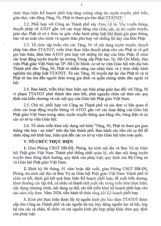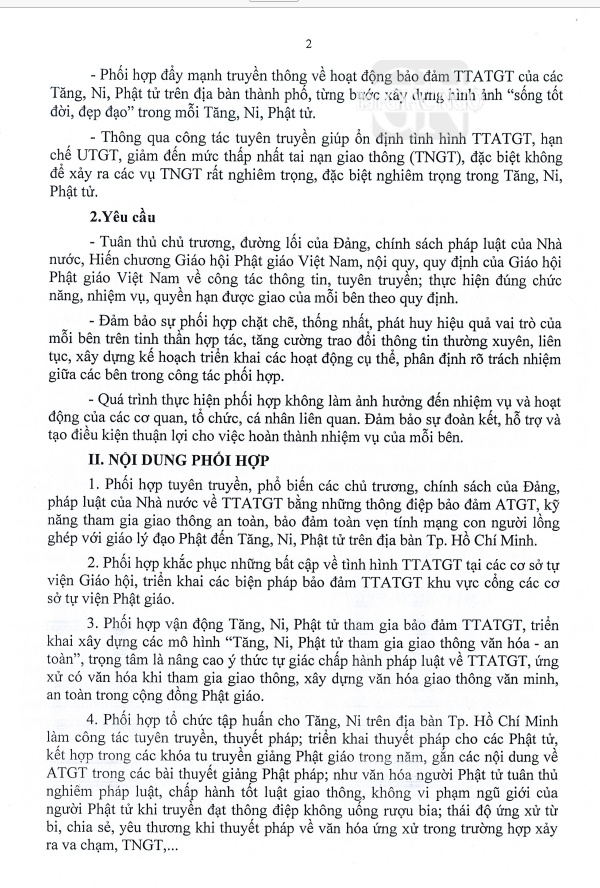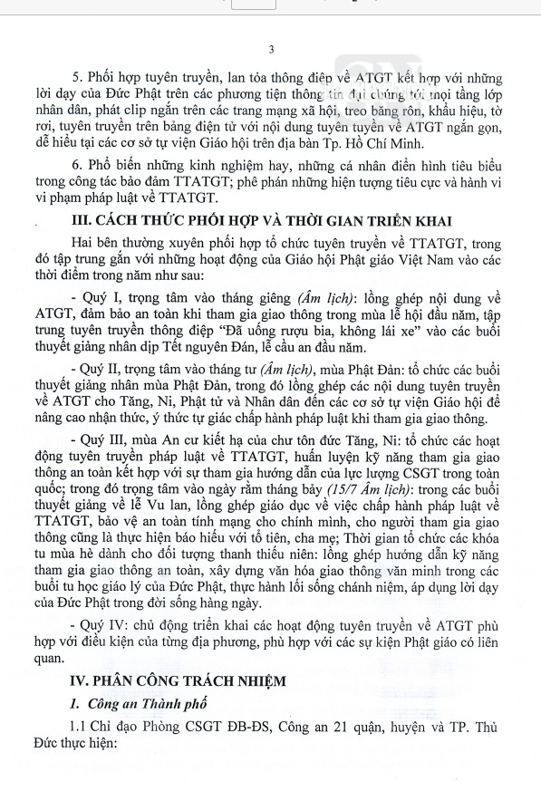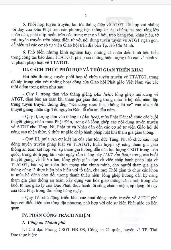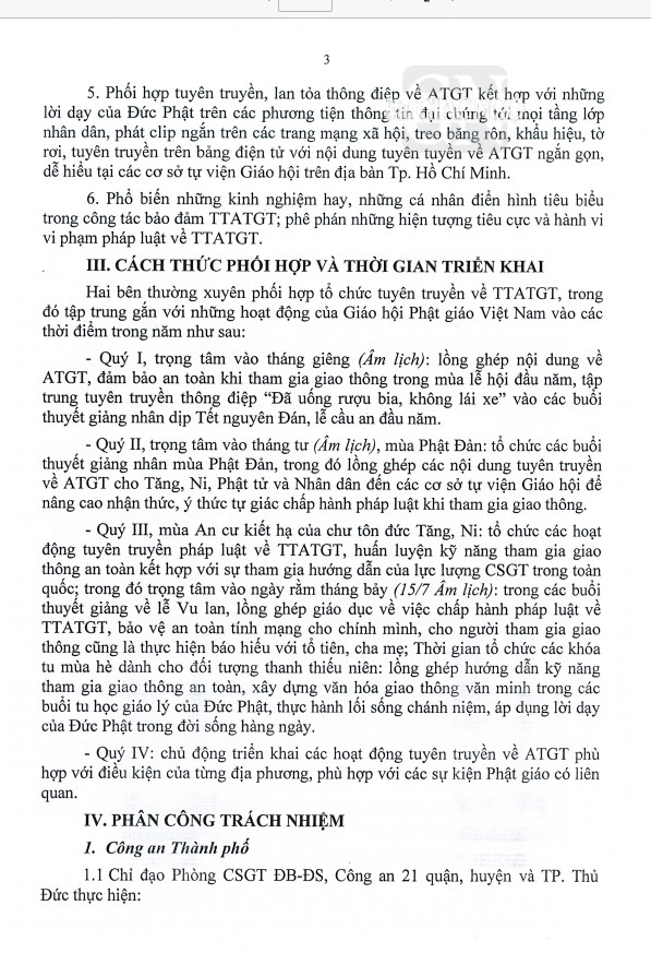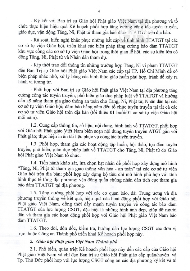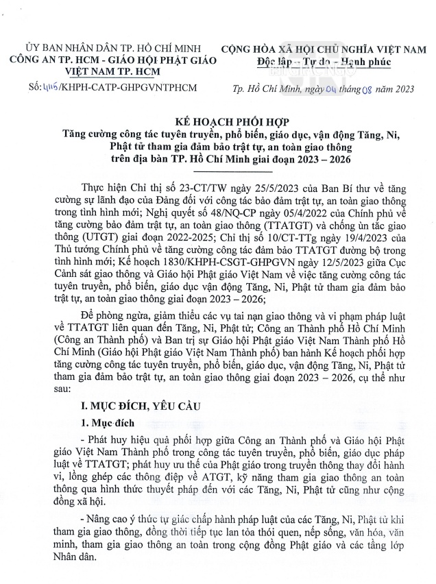 GNO - Văn bản kế hoạch số 4115/KHPH-CATPHCM-GHPGVNTPHCM giữa lãnh đạo GHPGVN TP.HCM và Công an TP.HCM ký ngày ngày 4-8-2023 được phổ biến về tăng cường công tác tuyên truyền, phổ biến, giáo dục, vận động Tăng Ni, Phật tử tham gia bảo đảm trật tự, an toàn giao thông trên địa bàn TP.HCM giai đoạn 2023-2026.