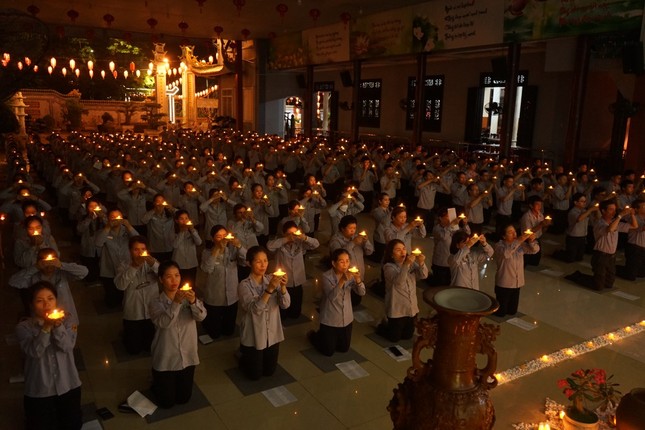 Trong không khí trang nghiêm và thanh tịnh, những ngọn nến lung linh tượng trưng cho ánh sáng từ bi và trí tuệ của chư Phật, Bồ-tát đã được các huynh trưởng Gia đình Phật tử thành kính dâng lên cúng dường Tam bảo và kết thành huy hiệu hoa sen của tổ chức Gia đình Phật tử Việt Nam với châm ngôn Bi - Trí - Dũng trước tôn tượng Đức Phật A Di Đà tại chùa Bà Đa.