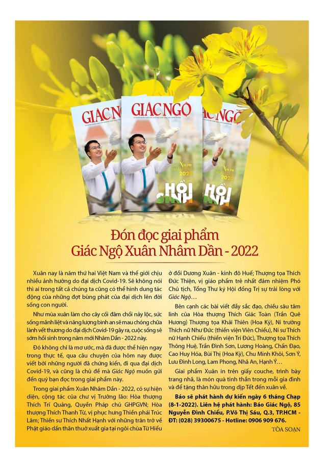 Báo sẽ phát hành dự kiến ngày 6 tháng Chạp (8-1-2022). Liên hệ phát hành: Báo Giác Ngộ, 85 Nguyễn Đình Chiểu, P.Võ Thị Sáu, Q.3, TP.HCM - ĐT: (028) 39300675 - Hotline: 0906 909 676.