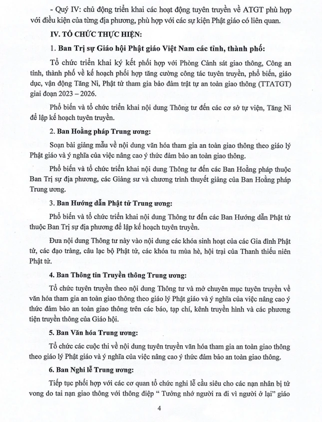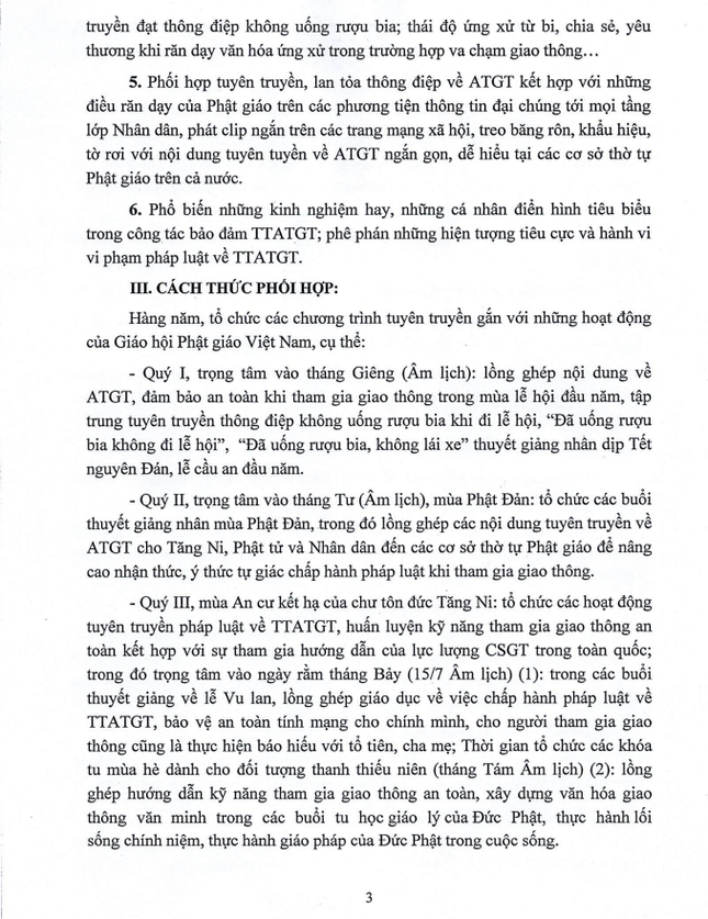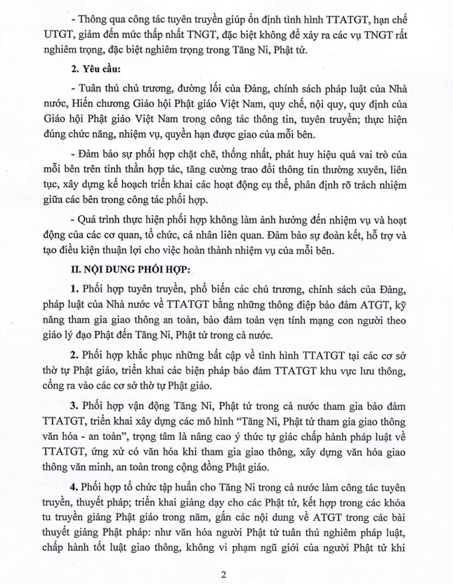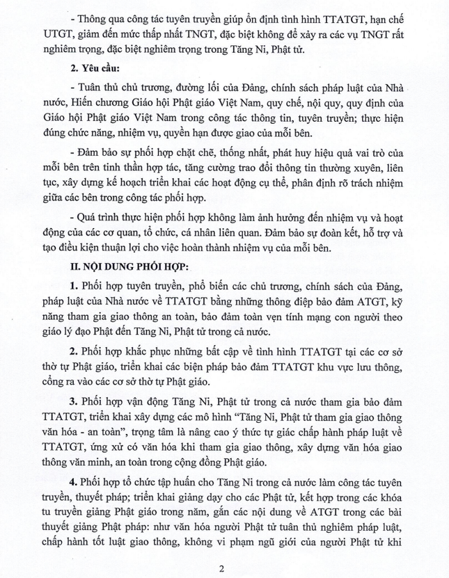 Thông tư cũng nêu các nội dung phối hợp, cách thức phối hợp nhằm tuyên truyền, lan tỏa thông điệp về an toàn giao thông kết hợp với những điều răn dạy của Phật giáo trên các phương tiện thông tin đại chúng tới mọi tầng lớp nhân dân, Phật tử.