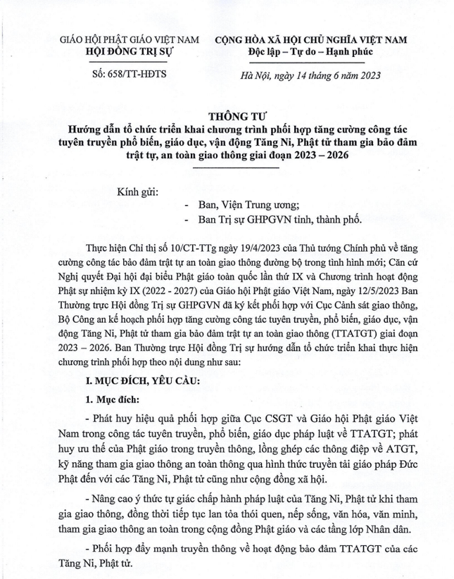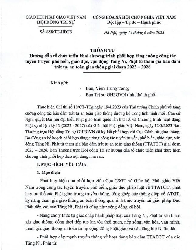 GNO - Hòa thượng Thích Thiện Nhơn, Chủ tịch Hội đồng Trị sự GHPGVN ấn ký Thông tư số 658/TT-HĐTS, ngày 14-6-2023 về hướng dẫn triển khai chương trình phối hợp tăng cường công tác tuyên truyền phổ biến, giáo dục, vận động Tăng Ni, Phật tử tham gia bảo đảm trật tự, an toàn giao thông giai đoạn 2023-2026.