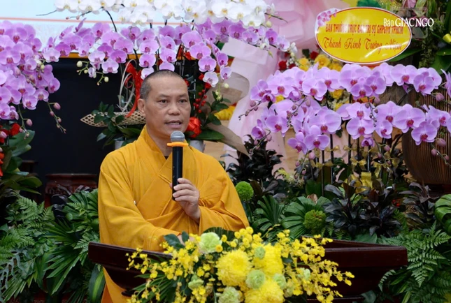 Thay mặt Ban Tổ chức, Thượng tọa Thích Phước Nguyên phát biểu tri ân chư tôn giáo phẩm, lãnh đạo các cơ quan đã quang lâm, đến tham dự lễ tưởng niệm.