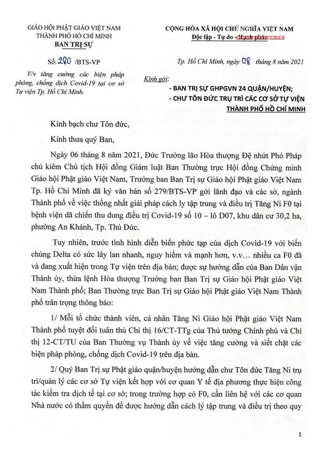 Công văn nêu: Ngày 6 tháng 8 năm 2021, Đức Trưởng lão Hòa thượng Đệ nhất Phó Pháp chủ kiêm Chủ tịch Hội đồng Giám luật Ban Thường trực Hội đồng Chứng minhGHPGVN, Trưởng ban Ban Trị sự GHPGVN TP.HCM đã ký văn bản số 279/BTS-VP gởi lãnh đạo và các sở, ngành Thành phố về việc thống nhất giải pháp cách ly tập trung và điều trị Tăng Ni F0 tại bệnh viện dã chiến thu dung điều trị Covid-19 số 10 - lô D07, khu dân cư 30,2 ha, phường An Khánh, TP.Thủ Đức.