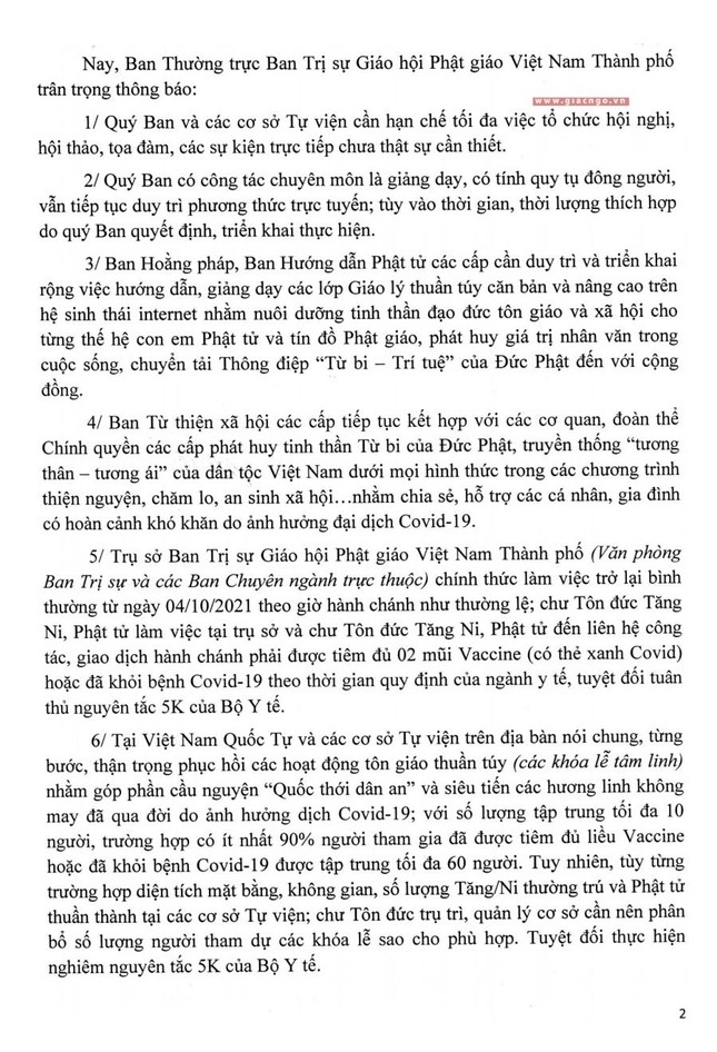 Trụ sở Ban Trị sự GHPGVN Thành phố tại Việt Nam Quốc Tự (Văn phòng Ban Trị sự và các Ban chuyên môn trực thuộc) chính thức làm việc trở lại bình thường từ ngày 4-10-2021 theo giờ hành chánh; chư tôn đức Tăng Ni, Phật tử làm việc tại trụ sở và chư tôn đức Tăng Ni, Phật tử đến liên hệ công tác, giao dịch hành chánh phải được tiêm đủ 2 mũi vắc-xin (có thẻ xanh Covid) hoặc đã khỏi bệnh Covid-19 theo thời gian quy định của ngành y tế, tuyệt đối tuân thủ nguyên tắc 5K của Bộ Y tế.