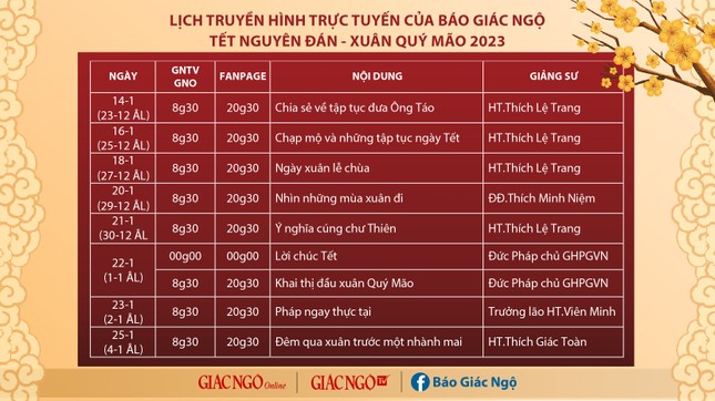 Giác Ngộ online cũng sẽ truyền hình trực tuyến lời chúc Tết của Hòa thượng Thích Thiện Nhơn, Chủ tịch Hội đồng Trị sự GHPGVN; cùng các pháp thoại đầu năm mới vô cùng ý nghĩa và sâu sắc từ các bậc tôn túc như Trưởng lão Hòa thượng Viên Minh - Phó Pháp chủ GHPGVN, Hòa thượng Thích Giác Toàn - Phó Chủ tịch Hội đồng Trị sự, Viện trưởng Viện Nghiên cứu Phật học VN, Trưởng ban Thường trực Giáo phẩm Hệ phái Khất sĩ…