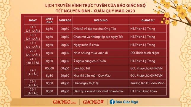 Lời chúc Tết của Đức Pháp chủ GHPGVN sẽ đồng thời trên Giác Ngộ online (giacngo.vn), Giác Ngộ TV và các nền tảng số của Báo Giác Ngộ vào thời khắc thiêng liêng chuyển giao giữa năm cũ Nhâm Dần và năm mới Quý Mão - 2023.