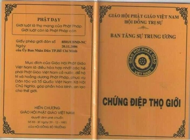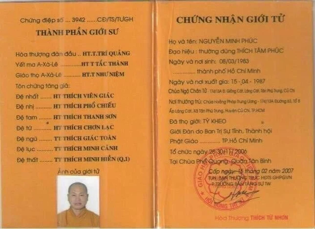 Theo đó, các giấy tờ như chứng điệp thọ giới, giấy chứng nhận Tăng Ni, quyết định bổ nhiệm trụ trì “chùa Hoằng Pháp Trung ương”… mang tên “Đại đức Thích Tâm Phúc” (Nguyễn Minh Phúc) được ghép, sao chụp ảnh chữ ký của lãnh đạo và khuôn dấu của Ban Thường trực Hội đồng Trị sự GHPGVN.