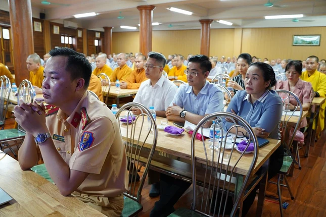 Bên cạnh đó, chư Tăng Ni, Phật tử cũng được nghe các báo cáo viên thuộc Phòng Cảnh sát Giao thông Công an TP.Hà Nội chia sẻ về tình hình trật tự an toàn giao thông trên địa bàn Thành phố và các quận, huyện; các quy định của pháp luật về trật tự an toàn giao thông, các quy tắc khi tham gia giao thông; những hành vi bị nghiêm cấm, trách nhiệm khi xảy ra tai nạn giao thông và kỹ năng xử lý các tình huống giao thông…