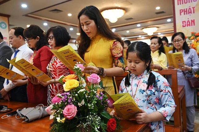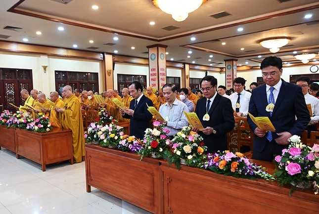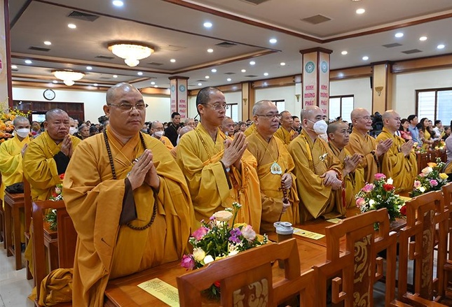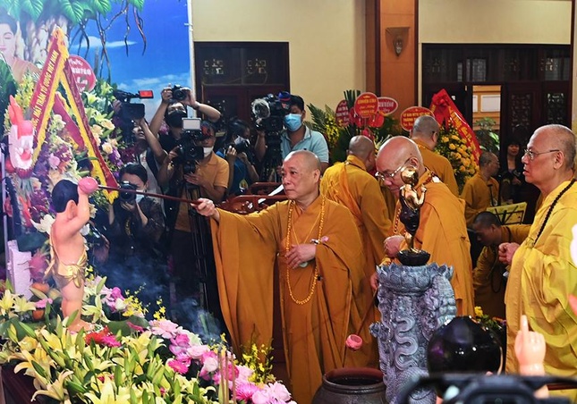 Tiếp sau đó, các chư tôn đức lãnh đạo GHPGVN trang nghiêm cử hành nghi lễ dâng hương, tụng kinh Chuyển Pháp luân và nghi thức tắm Phật truyền thống.
