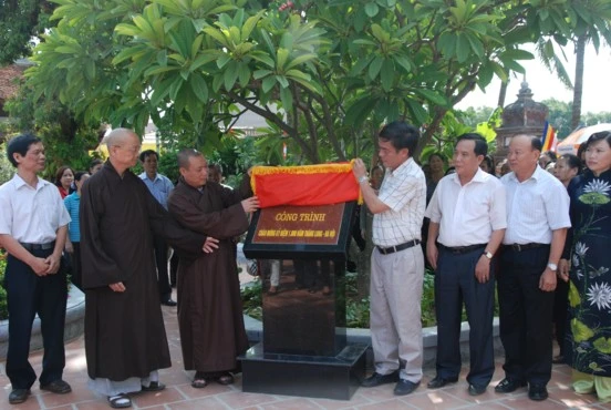 Cuối buổi lễ, chư tôn đức cùng quý vị quan khách tham dự đã tiến hành gắn biển công trình tu bổ tôn tạo di tích chùa Kim Liên chào mừng kỷ niệm 1.000 năm Thăng Long - Hà Nội.