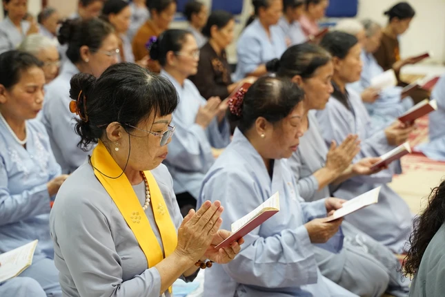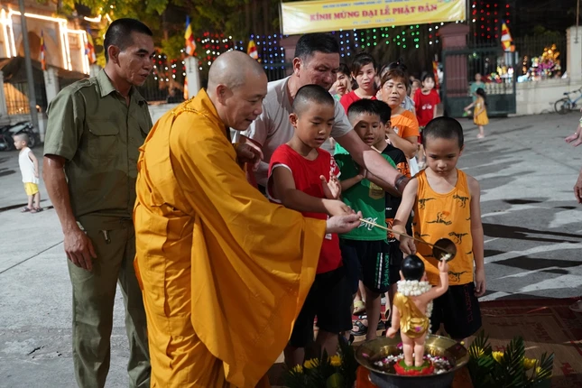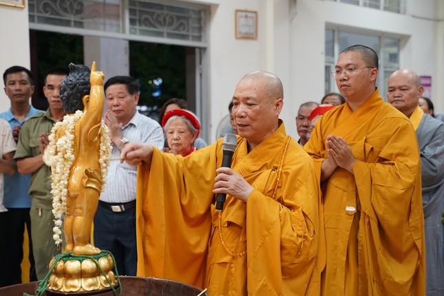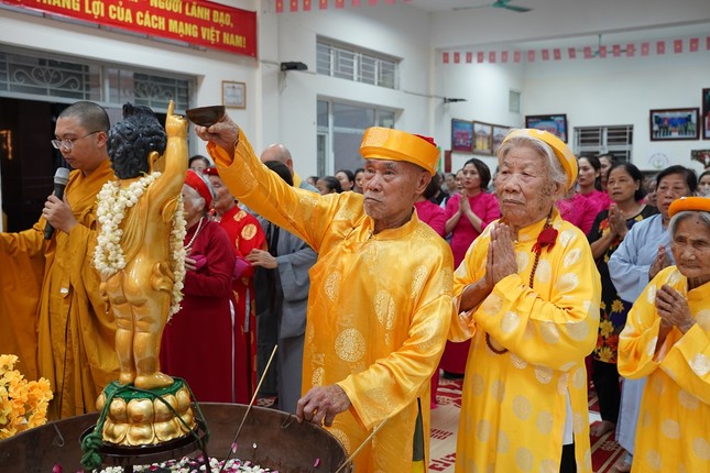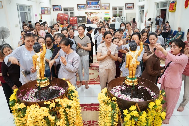 Chư tôn đức cùng đại chúng tụng sám Phật đản và thực hiện lễ Tắm Phật theo truyền thống. Các cư dân cao niên, nam thanh nữ tú trong khu dân cư nô nức, hoan hỷ xếp hàng chờ Tắm Phật.