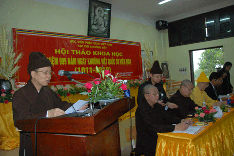 ĐĐ Thích Thanh Quyết thông qua báo cáo đề dẫn Hội thảo. Quốc sư Khuông Việt, thế danh Ngô Chân Lưu, dòng dõi Ngô Vương sinh năm 933, viên tịch ngày 15 tháng 02 năm Tân Hợi (1011) Ngài là Tăng thống Quốc sư, là cố vấn chính trị, quân sự, ngoại giao xuất sắc của hai triều đại Đinh Lê. Những năm tuổi già, Ngài về quê hương vùng đất Phù Linh Sóc Sơn dựng chùa, mở trường dạy học….