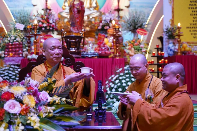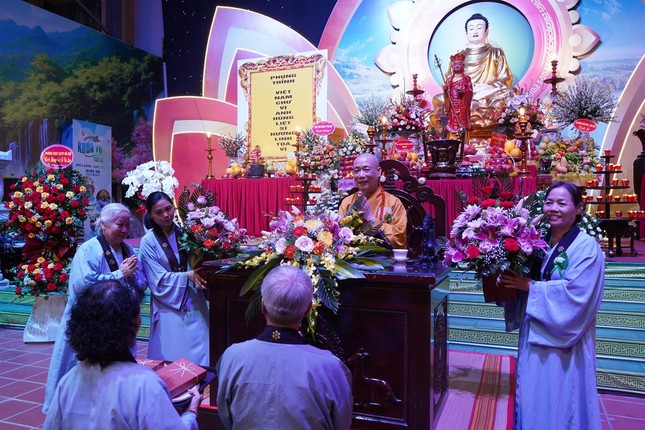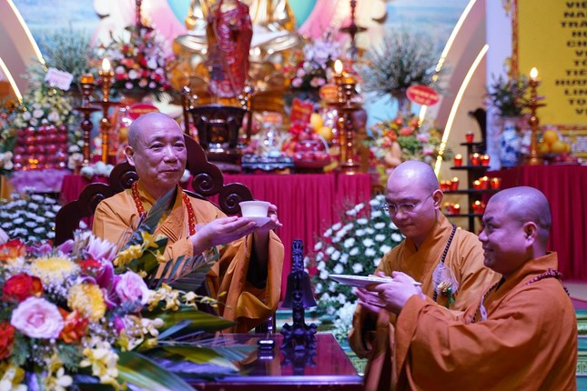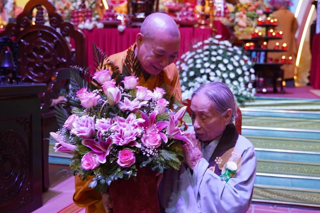 Sau đó, Đại đức Thích Thanh Hải cùng chư Tăng chùa Bằng và đại diện Phật tử đạo tràng Pháp Hoa miền Bắc đã thành kính dâng hoa, dâng trà mừng khánh tuế Hòa thượng tôn sư. Các bạn trẻ cũng đã lần lượt dâng trà lên bậc cao niên tham dự buổi lễ.