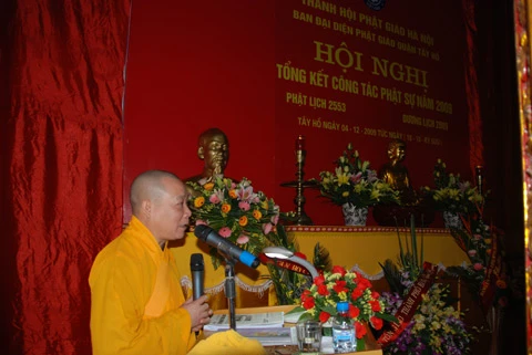 TT. Thích Thanh Nhã thay mặt Ban đại diện Phật giáo quận Tây Hồ đọc bản báo cáo tổng kết công tác Phật sự năm 2009 và phương hướng hoạt động cho năm 2010.