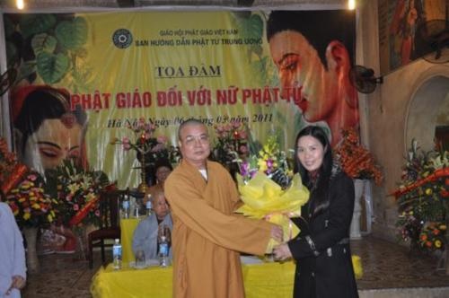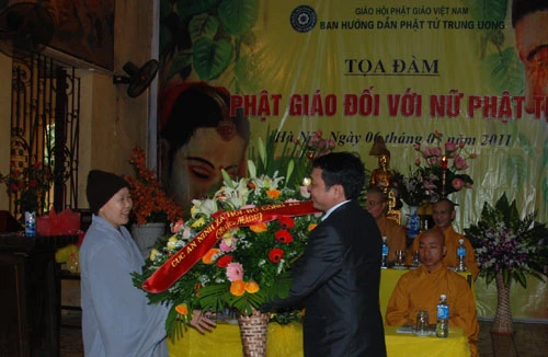 Nhân dịp này TT Thích Thanh Nhiễu – thay mặt GHPGVN tặng hoa chúc mừng bà Trần Minh Ngà - đại diện các nữ cơ quan chính quyền.