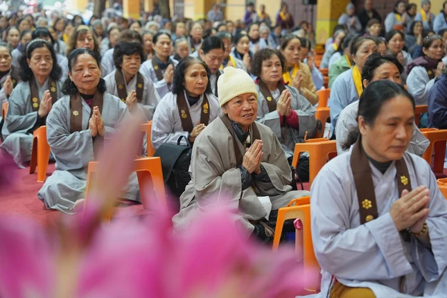 Theo chương trình tu học, đại chúng chuyên tâm trì tụng kinh A Di Đà và Bổn môn, nhiễu Phật trong tiếng niệm “Nam-ô A Di Đà Phật” âm vang chốn thiền môn, thành kính cầu nguyện sự an lạc, yên vui trong cuộc sống và hòa bình cho tất cả chúng sinh.