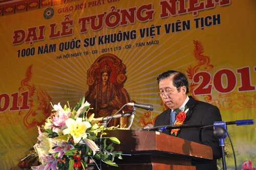 Hòa thượng Thích Thiện Nhơn, Phó Chủ tịch kiêm Tổng Thư ký HĐTS đọc tiểu sử Quốc sư Khuông Việt (thế danh Ngô Chân Lưu), sinh năm 930 tại làng Cát Lợi, phủ Thường Lạc, nay là xã Phục Linh, huyện Sóc Sơn, Hà Nội. Lớn lên, ông xuất gia tu học tại chùa Phật Đà. Năm 20 tuổi, cùng trụ trì chùa Phật Đà đến chùa Khai Quốc (Trấn Quốc) cầu pháp, thụ Đại giới với Thiền sư Vân Phong. Sau khi sư Vân Phong viên tịch (956), ngài trụ trì chùa Khai Quốc và hóa đạo tại đây.