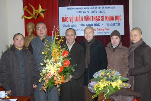 Hai vị bảo vệ luận văn gồm học viên Đặng Minh Châu (TT. Thích Bảo Nghiêm - Phó chủ tịch HĐTS kiêm Trưởng Ban Hoằng Pháp TƯ) với đề tài "Mối quan hệ giữa Phật giáo và tín ngưỡng dân gian" và học viên Dương Quang Điện (TT. Thích Thanh Điện - Uỷ viên thường trực HĐTS, Phó ban Thường trực Ban hướng dẫn Phật tử TƯ) với đề tài "Ảnh hưởng của Phật giáo đến văn hoá dân gian Việt Nam".