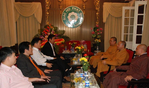 Tiếp đoàn, có TT. Thích Thanh Nhiễu - Phó Chủ tịch HĐTS; TT. Thích Gia Quang - Phó Tổng Thư ký kiêm Chánh Văn phòng I TƯGH; ĐĐ. Thích Minh Tiến - Uỷ viên Thường trực HĐTS, Phó Văn phòng I.