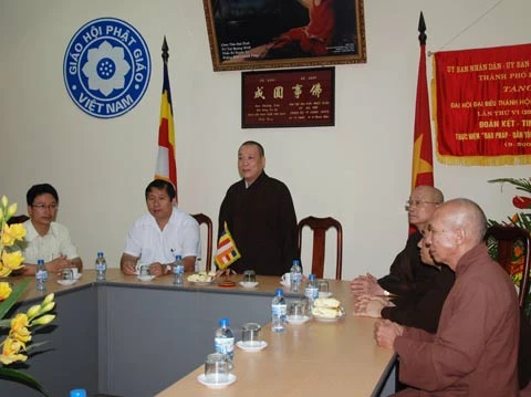 TT.Thích Bảo Nghiêm thay mặt Thành hội Phật giáo Hà Nội bày tỏ lòng tri ân sâu sắc trước sự quan tâm của lãnh đạo Ủy ban MTTQ Việt Nam đối với Thành hội Phật giáo Hà Nội.