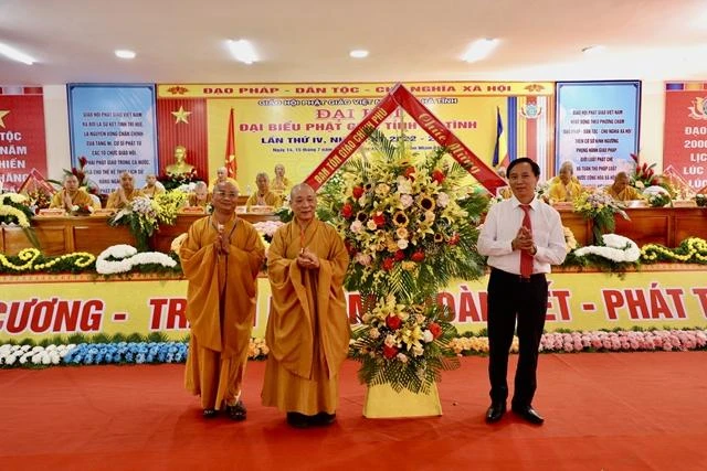 Ông Lê Ngọc Châu, Phó Chủ tịch UBND tỉnh Hà Tĩnh phát biểu chúc mừng đại hội, biểu dương những hoạt động Phật sự trong thời gian qua của Ban Trị sự, những thành quả đó là rất đáng tự hào, khẳng định sức mạnh và trí tuệ của mỗi Tăng Ni, Phật tử tỉnh nhà.