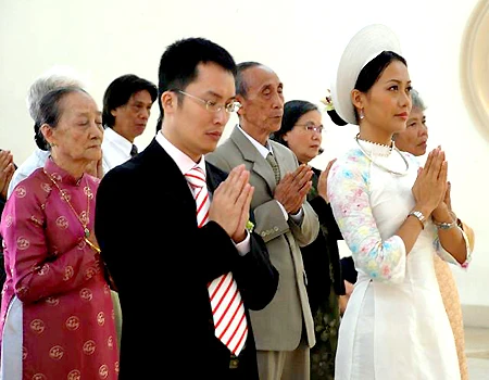 Hôn lễ của DVĐA Hồng Ánh được tổ chức tại chùa - Ảnh: Giác Thông