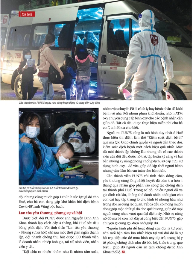 Được biết, đội "Phản ứng nhanh 75" được anh Nguyễn Đình Anh Khoa thành lập cách đây 4 tháng, khi Huế bắt đầu bùng phát dịch. Với tinh thần “Lan tỏa yêu thương - Phụng sự xã hội”, chỉ sau một thời gian ngắn thành lập, đội nhanh chóng thu hút được 100 thành viên là doanh nhân, nhiếp ảnh gia, tài xế, sinh viên, nhân viên y tế…