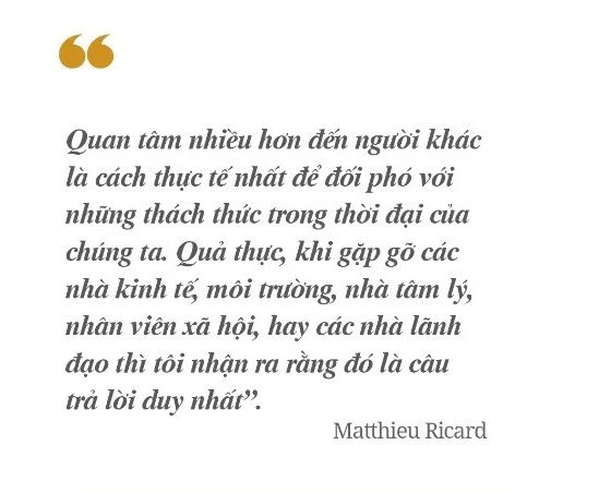 Thầy Matthieu Ricard đã viết trong cuốn sách mới của mình có tựa đề Altruism: The Power of Compassion to Change Yourself and the World (tạm dịch: Lòng vị tha: Sức mạnh của lòng bi mẫn thay đổi bản thân và thế giới): “Trong thời hiện đại này, chúng ta đang phải đối mặt với rất nhiều thách thức. Một trong những vấn đề chính bao gồm việc dung hòa các nhu cầu của nền kinh tế, tìm kiếm hạnh phúc và tôn trọng môi trường tự nhiên. Ba khía cạnh này tương ứng với ba thang thời gian-ngắn, trung và dài hạn - cùng với đó là ba loại lợi ích: lợi ích của bản thân chúng ta, của những người thân thiết và của tất cả chúng sinh”.
