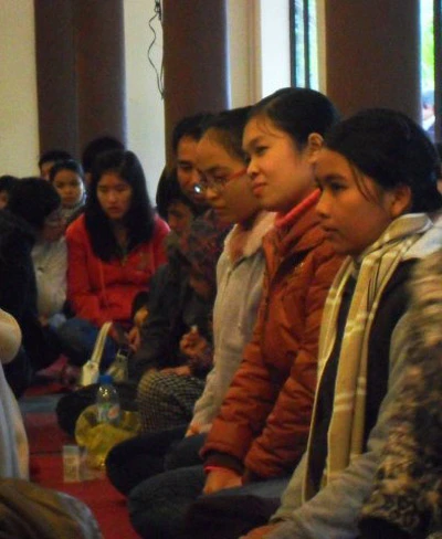 Hai mẹ con tham dự chắp tay niệm búp sen ngồi đợi đến lượt mình