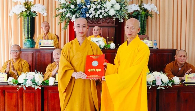 Dịp này, Thượng tọa Thích Thông Hạnh trao quyết định bổ sung trợ lý Trưởng ban Trị sự GHPGVN tỉnh đến Đại đức Thích Quảng Nguyên.