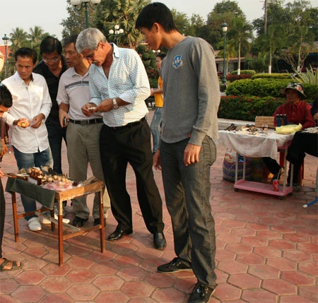 Các tuyển thủ thay phiên chụp ảnh cho nhau làm kỷ niệm về ngôi chùa That Luong, ngay cả thầy “Tô” cũng phải bận rộn với công việc chụp hình để ghi lại những nét kiến trúc đặc sắc, tinh hoa của ngôi chùa đẹp nhất
