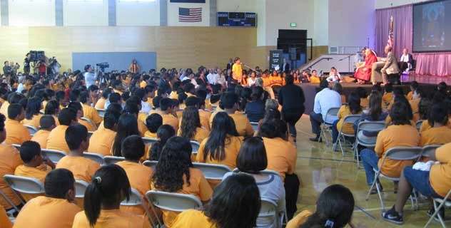His Holiness the Dalai Lama answers a question from a student during his visit to Castano Middle School in East Palo Alto, California, on October 13th, 2010. Students from several schools in the area came to interact with His Holiness.