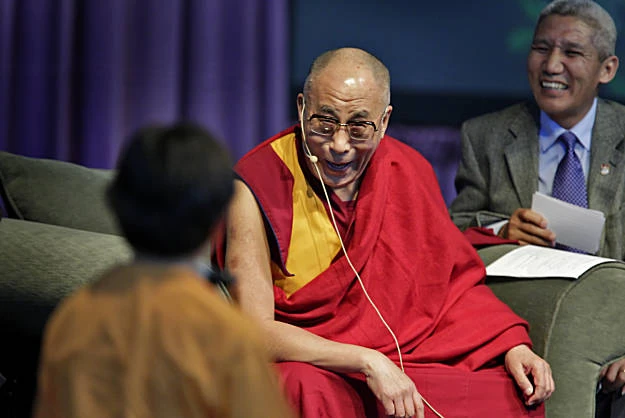 The Dalai Lama laughs after asking students how old they think he is during questions at Costano School in East Palo Alto.