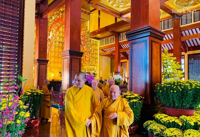 Hòa thượng Chủ tịch và phái đoàn đã dâng hương, lễ Tổ tại Tổ đường Việt Nam Quốc Tự, sau đó thăm chánh điện và hội trường – nơi đang thiết trí đàn tràng chuẩn bị cho Pháp hội Dược Sư đầu năm Quý Mão - 2023 do GHPGVN TP.HCM tổ chức.