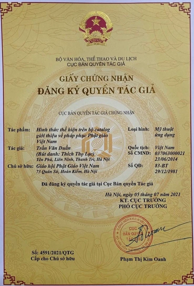 Mới đây, ngày 5-7-2021, Cục Bản quyền tác giả thuộc Bộ Văn hóa, Thể thao và Du lịch cũng đã cấp Giấy chứng nhận Đăng ký quyền tác giả đối với tác phẩm “Hình thức thể hiện trên bộ catalog giới thiệu về pháp phục Phật giáo Việt Nam”. Trong đó, tác giả là Thượng tọa Thích Thọ Lạc, Trưởng ban Văn hóa Trung ương, với chủ sở hữu là GHPGVN.